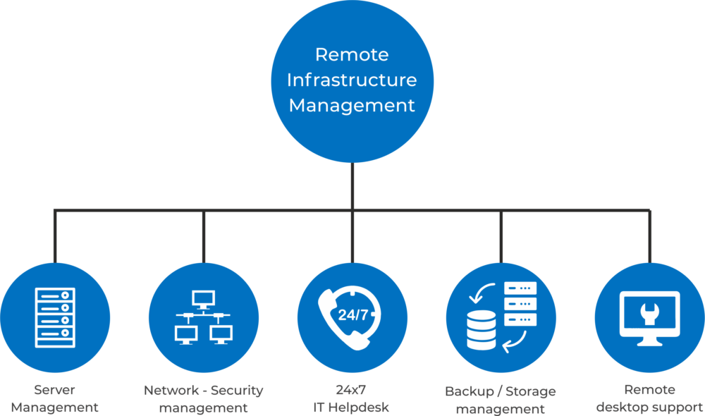 Remote infrastructure management is the remote management of information technology infrastructure. This can include the management of computer hardware and software, such as workstations, servers, network devices, storage devices, IT security devices, etc. of a company.